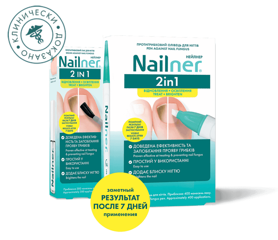 Застосовувати протигрибковий лак при оніхомікозі не тільки просто, а й ефективно. Глибоко проникаючи у осередок інфекції, Нейлнер 2в1 знищує її, відновлюючи колір нігтьової пластини та додаючи блиску. Завдяки унікальній запатентованій формулі, пацієнти бачать помітний результат вже через тиждень використання цього засобу.